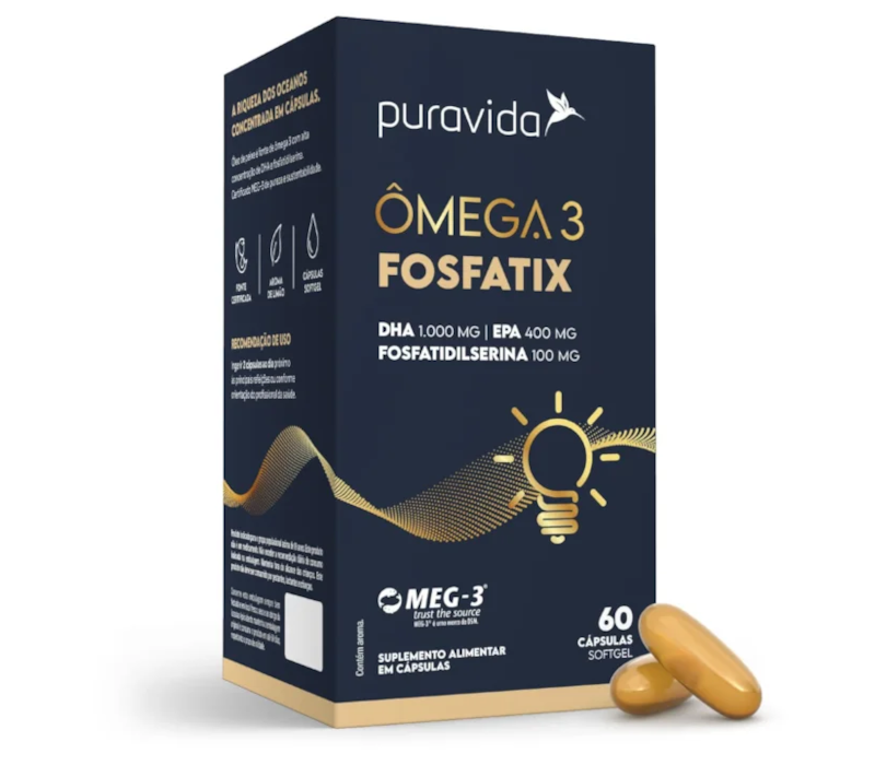 O Ômega 3 Fosfatix Puravida é elaborado com óleo de peixe e contém elevada concentração de DHA associado a fosfatidilserina.