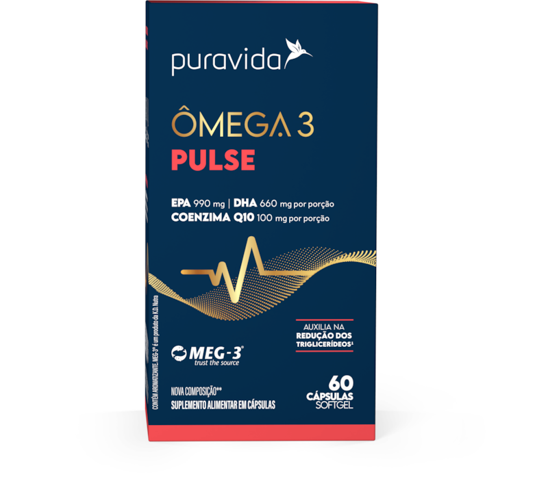 O Ômega 3 Pulse é uma fonte de ômega-3, com alta concentração de EPA (990mg), DHA (660mg) e coenzima Q10 (100mg)